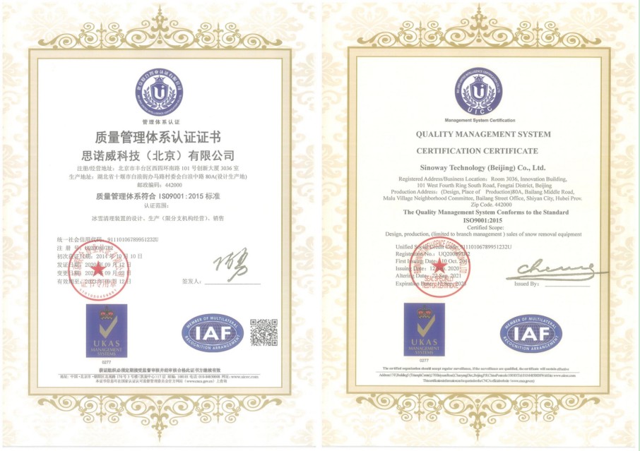 公司总部位于北京,在‘中国商用车之都’湖北省十堰市设有研发、生产、测试基地;公司集全系列除雪设备、中高端路面清扫养护设备的研发、制造、销售、服务、技术引进等于一体。公司先后通过ISO9001质量管理体系、ISO14001环境管理体系、ISO45001职业健康安全管理体系认证,并严格在ISO体系指导下进行生产制造。