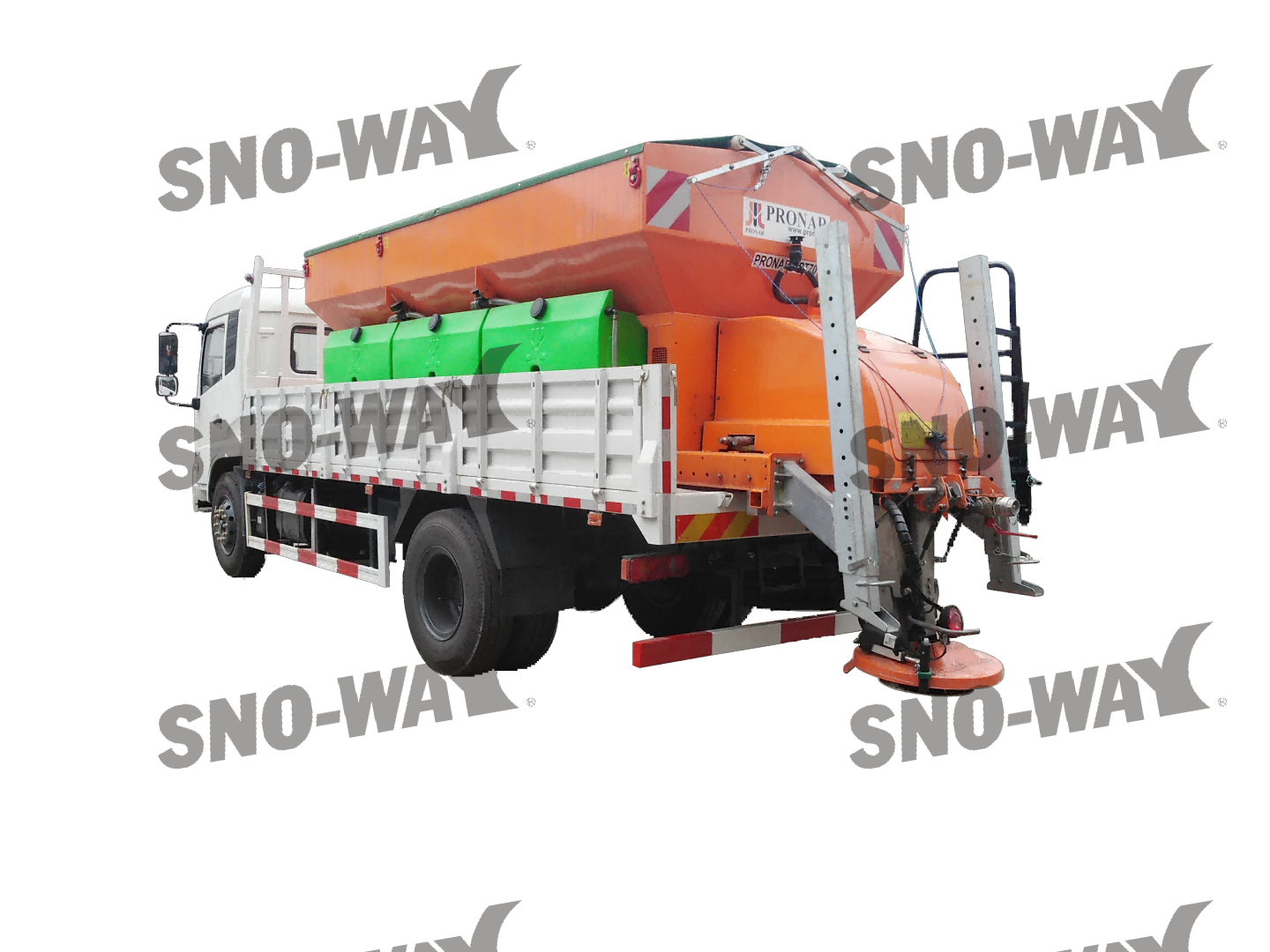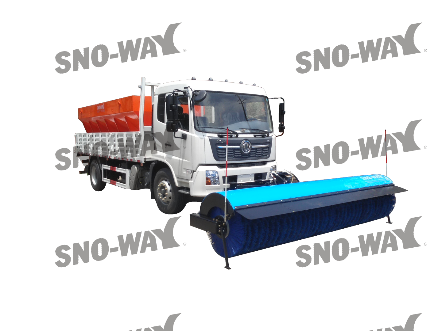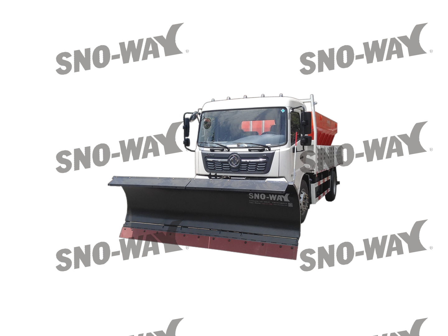 东风天锦除雪车DFT5180TCXZME1/EQ5180TCXZME,前部可选装可互换式RBA/RWH系列滚刷,100系列推雪铲,中部可选装US系列推雪铲与WP系列推雪铲,后部可选装PRONAR/思诺威SSV系列撒布机。整车集破冰、推雪、扫雪、撒布功能于一体,采用中央液压集成系统,根据降雪地区的不同情况,各种设备之间可进行模块化组合,为除雪作业提供优化的实施方案。